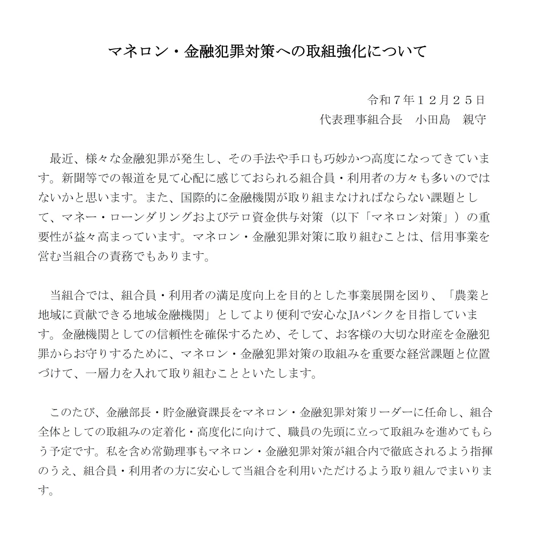 今金発!ニュース バックナンバー 2025年12月 (2) 2025年11月 (1) 2025年10月 (1) 2025年8月 (1) 2025年5月 (2) 2025年4月 (1) 2025年2月 (1) 2025年1月 (2) 2024年5月 (2) 2024年3月 (1) 2024年2月 (1) 2024年1月 (1) 2023年12月 (1) 2023年9月 (1) 2023年7月 (2) 2023年6月 (2) 2023年5月 (1) 2023年4月 (2) 2023年3月 (1) 2023年2月 (2) 2023年1月 (2) 2022年12月 (3) 2022年11月 (3) 2022年10月 (1) 2022年9月 (1) 2022年8月 (7) 2022年7月 (4) 2022年6月 (2) 2022年5月 (1) 2022年4月 (3) 2022年3月 (4) 2022年1月 (7) 2021年12月 (8) 2021年11月 (1) 2021年10月 (2) 2021年9月 (1) 2021年8月 (2) 2021年7月 (1) 2021年6月 (7) 2021年5月 (6) 2021年4月 (4) 2021年3月 (4) 2021年2月 (1) 2021年1月 (5) 2020年12月 (1) 2020年11月 (6) 2020年10月 (2) 2020年9月 (1) 2020年8月 (1) 2020年7月 (2) 2019年10月 (2) 2019年9月 (2) 2019年8月 (1) 2019年5月 (1) 2019年3月 (1) 2018年11月 (2) 2018年9月 (1) 2017年10月 (1) 2017年5月 (1) 2017年2月 (1) 2016年10月 (2) 2016年9月 (4) 2016年8月 (4) 2016年7月 (1) 2016年6月 (1) 2016年5月 (2) 2016年4月 (10) 2016年3月 (9) 2016年2月 (2) 2015年9月 (3) 2015年6月 (1) 2015年4月 (4) 2015年3月 (2) 2015年2月 (3) 2014年12月 (2) 2014年11月 (1) 2014年10月 (3) 2014年9月 (5) 2014年8月 (3) 2014年7月 (1) 2014年6月 (2) 2014年5月 (2) 2014年4月 (3) 2014年3月 (4) 2014年2月 (5) 2014年1月 (3) 2013年12月 (6) 2013年11月 (4) 2013年10月 (2) 2013年9月 (6) 2013年8月 (4) 2013年6月 (2) 2013年5月 (11) 2013年4月 (10) 2013年3月 (1) 2013年2月 (5) 2013年1月 (1) 2012年12月 (9) 2012年11月 (14) 2012年10月 (14) 2012年9月 (15) 2012年8月 (10) 2012年4月 (1) 2012年3月 (2) 2012年2月 (3) 2012年1月 (4) 2011年11月 (7) 2011年10月 (6) 2011年9月 (2) 2011年7月 (1) 2011年6月 (5) 2011年4月 (1) 2011年2月 (1) 2010年11月 (1) 2010年10月 (2) 2010年9月 (4) 2010年8月 (1) 2009年6月 (3) 2009年5月 (2) 2008年11月 (3) 2008年10月 (3) 2008年9月 (3) 2008年8月 (4) 2008年7月 (2) 2008年6月 (2) 2008年5月 (2) 2008年4月 (3) Blog Category 各部からのお知らせ いまかね通信 ~地域の話題をお届けします!~ (275) JA今金町青年部 (29) JA今金町女性部 (24) 管理部 (9) 入札情報 (2) 一般事業主行動計画 (4) 営農部 (14) 北海道今金町フードリポート〜食の現場から〜2009 (5) 北海道今金町フードリポート〜食の現場から〜 (16) 金融部 (15) 経済部 (3) Aコープ (10) いまかね通信 ~地域の話題をお届けします!~ JA今金町青年部 JA今金町女性部 管理部 入札情報 一般事業主行動計画 営農部 北海道今金町フードリポート〜食の現場から〜2009 北海道今金町フードリポート〜食の現場から〜 金融部 経済部 Aコープ 【トップメッセージ】マネロン・金融犯罪対策への取組強化について 2025/12/25 ホームに戻る バックナンバー 2025年12月 (2) 2025年11月 (1) 2025年10月 (1) 2025年8月 (1) 2025年5月 (2) 2025年4月 (1) 2025年2月 (1) 2025年1月 (2) 2024年5月 (2) 2024年3月 (1) 2024年2月 (1) 2024年1月 (1) 2023年12月 (1) 2023年9月 (1) 2023年7月 (2) 2023年6月 (2) 2023年5月 (1) 2023年4月 (2) 2023年3月 (1) 2023年2月 (2) 2023年1月 (2) 2022年12月 (3) 2022年11月 (3) 2022年10月 (1) 2022年9月 (1) 2022年8月 (7) 2022年7月 (4) 2022年6月 (2) 2022年5月 (1) 2022年4月 (3) 2022年3月 (4) 2022年1月 (7) 2021年12月 (8) 2021年11月 (1) 2021年10月 (2) 2021年9月 (1) 2021年8月 (2) 2021年7月 (1) 2021年6月 (7) 2021年5月 (6) 2021年4月 (4) 2021年3月 (4) 2021年2月 (1) 2021年1月 (5) 2020年12月 (1) 2020年11月 (6) 2020年10月 (2) 2020年9月 (1) 2020年8月 (1) 2020年7月 (2) 2019年10月 (2) 2019年9月 (2) 2019年8月 (1) 2019年5月 (1) 2019年3月 (1) 2018年11月 (2) 2018年9月 (1) 2017年10月 (1) 2017年5月 (1) 2017年2月 (1) 2016年10月 (2) 2016年9月 (4) 2016年8月 (4) 2016年7月 (1) 2016年6月 (1) 2016年5月 (2) 2016年4月 (10) 2016年3月 (9) 2016年2月 (2) 2015年9月 (3) 2015年6月 (1) 2015年4月 (4) 2015年3月 (2) 2015年2月 (3) 2014年12月 (2) 2014年11月 (1) 2014年10月 (3) 2014年9月 (5) 2014年8月 (3) 2014年7月 (1) 2014年6月 (2) 2014年5月 (2) 2014年4月 (3) 2014年3月 (4) 2014年2月 (5) 2014年1月 (3) 2013年12月 (6) 2013年11月 (4) 2013年10月 (2) 2013年9月 (6) 2013年8月 (4) 2013年6月 (2) 2013年5月 (11) 2013年4月 (10) 2013年3月 (1) 2013年2月 (5) 2013年1月 (1) 2012年12月 (9) 2012年11月 (14) 2012年10月 (14) 2012年9月 (15) 2012年8月 (10) 2012年4月 (1) 2012年3月 (2) 2012年2月 (3) 2012年1月 (4) 2011年11月 (7) 2011年10月 (6) 2011年9月 (2) 2011年7月 (1) 2011年6月 (5) 2011年4月 (1) 2011年2月 (1) 2010年11月 (1) 2010年10月 (2) 2010年9月 (4) 2010年8月 (1) 2009年6月 (3) 2009年5月 (2) 2008年11月 (3) 2008年10月 (3) 2008年9月 (3) 2008年8月 (4) 2008年7月 (2) 2008年6月 (2) 2008年5月 (2) 2008年4月 (3) Blog Category 各部からのお知らせ いまかね通信 ~地域の話題をお届けします!~ (275) JA今金町青年部 (29) JA今金町女性部 (24) 管理部 (9) 入札情報 (2) 一般事業主行動計画 (4) 営農部 (14) 北海道今金町フードリポート〜食の現場から〜2009 (5) 北海道今金町フードリポート〜食の現場から〜 (16) 金融部 (15) 経済部 (3) Aコープ (10) いまかね通信 ~地域の話題をお届けします!~ JA今金町青年部 JA今金町女性部 管理部 入札情報 一般事業主行動計画 営農部 北海道今金町フードリポート〜食の現場から〜2009 北海道今金町フードリポート〜食の現場から〜 金融部 経済部 Aコープ
