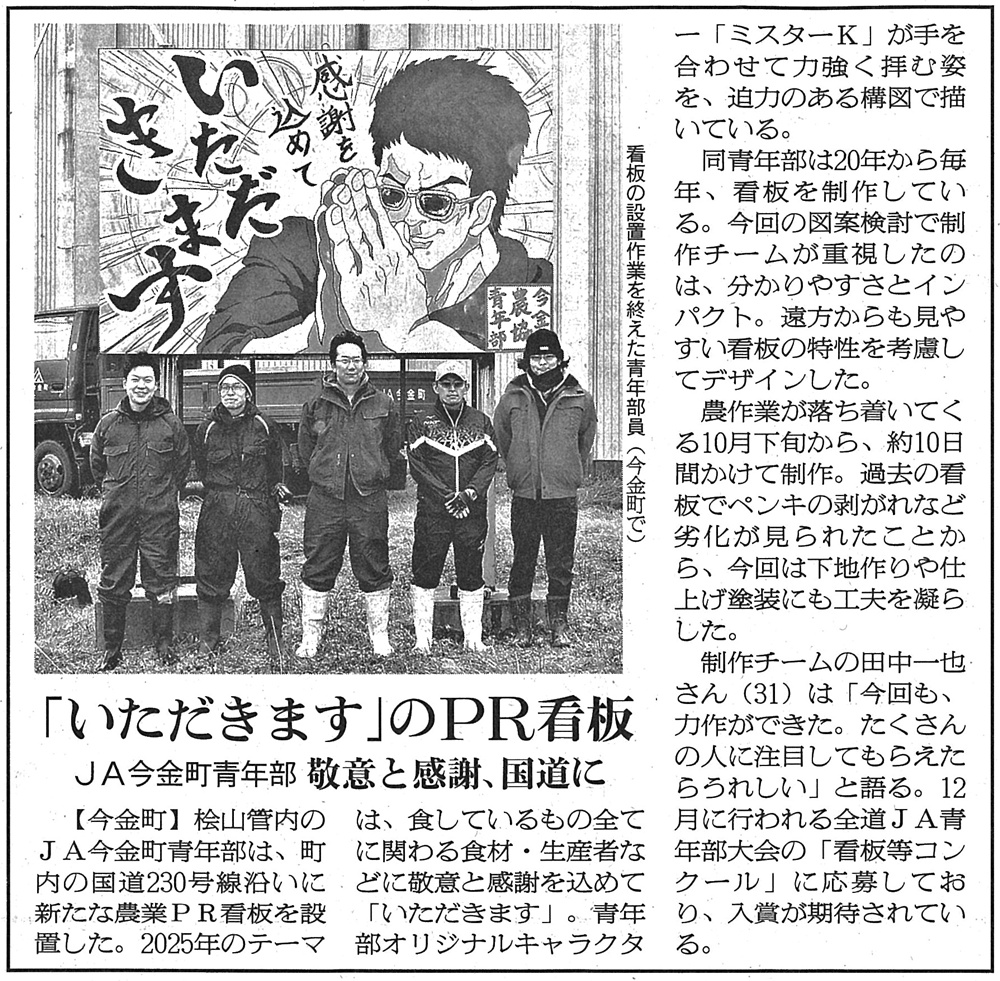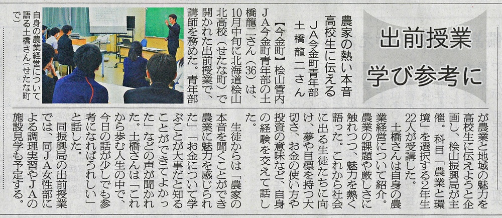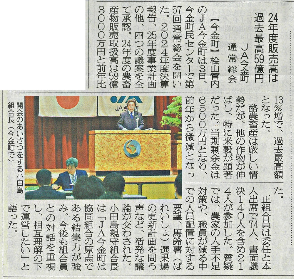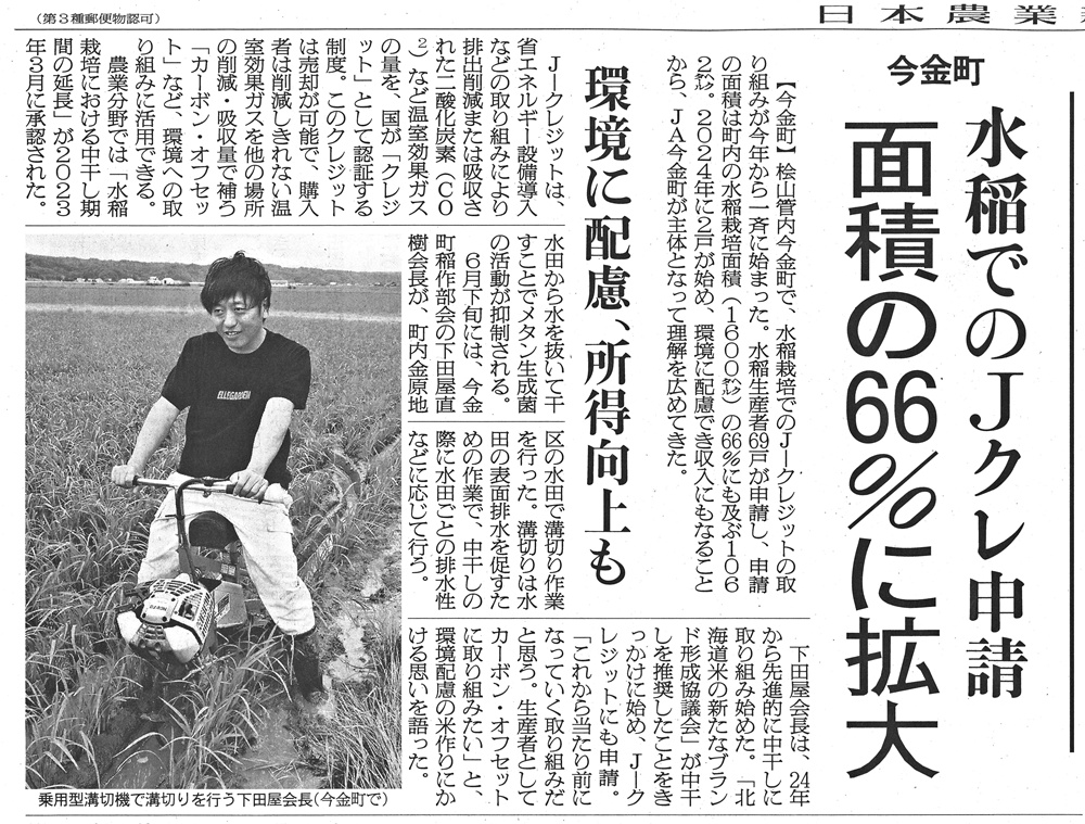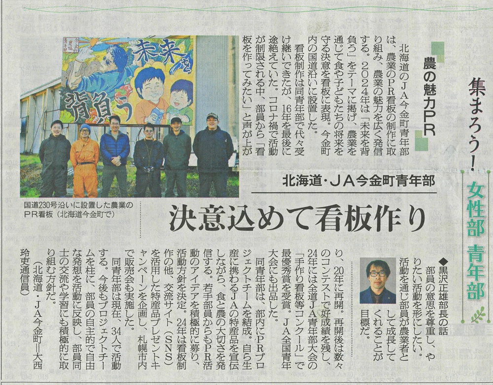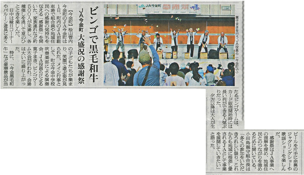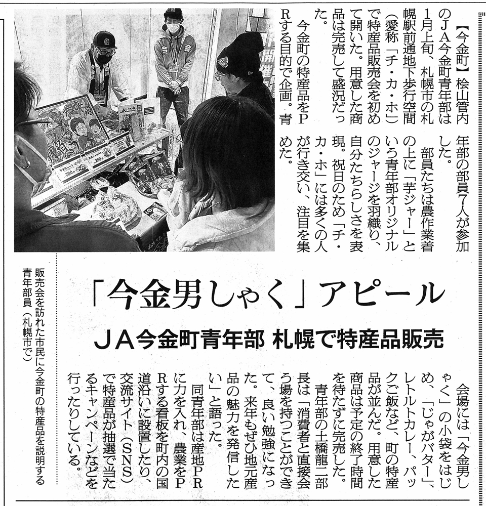 今金発!ニュース バックナンバー 2026年1月 (1) 2025年12月 (2) 2025年11月 (1) 2025年10月 (1) 2025年8月 (1) 2025年5月 (2) 2025年4月 (1) 2025年2月 (1) 2025年1月 (2) 2024年5月 (2) 2024年3月 (1) 2024年2月 (1) 2024年1月 (1) 2023年12月 (1) 2023年9月 (1) 2023年7月 (2) 2023年6月 (2) 2023年5月 (1) 2023年4月 (2) 2023年3月 (1) 2023年2月 (2) 2023年1月 (2) 2022年12月 (3) 2022年11月 (3) 2022年10月 (1) 2022年9月 (1) 2022年8月 (7) 2022年7月 (4) 2022年6月 (2) 2022年5月 (1) 2022年4月 (3) 2022年3月 (4) 2022年1月 (7) 2021年12月 (8) 2021年11月 (1) 2021年10月 (2) 2021年9月 (1) 2021年8月 (2) 2021年7月 (1) 2021年6月 (7) 2021年5月 (6) 2021年4月 (4) 2021年3月 (4) 2021年2月 (1) 2021年1月 (5) 2020年12月 (1) 2020年11月 (6) 2020年10月 (2) 2020年9月 (1) 2020年8月 (1) 2020年7月 (2) 2019年10月 (2) 2019年9月 (2) 2019年8月 (1) 2019年5月 (1) 2019年3月 (1) 2018年11月 (2) 2018年9月 (1) 2017年10月 (1) 2017年5月 (1) 2017年2月 (1) 2016年10月 (2) 2016年9月 (4) 2016年8月 (4) 2016年7月 (1) 2016年6月 (1) 2016年5月 (2) 2016年4月 (10) 2016年3月 (9) 2016年2月 (2) 2015年9月 (3) 2015年6月 (1) 2015年4月 (4) 2015年3月 (2) 2015年2月 (3) 2014年12月 (2) 2014年11月 (1) 2014年10月 (3) 2014年9月 (5) 2014年8月 (3) 2014年7月 (1) 2014年6月 (2) 2014年5月 (2) 2014年4月 (3) 2014年3月 (4) 2014年2月 (5) 2014年1月 (3) 2013年12月 (6) 2013年11月 (4) 2013年10月 (2) 2013年9月 (6) 2013年8月 (4) 2013年6月 (2) 2013年5月 (11) 2013年4月 (10) 2013年3月 (1) 2013年2月 (5) 2013年1月 (1) 2012年12月 (9) 2012年11月 (14) 2012年10月 (14) 2012年9月 (15) 2012年8月 (10) 2012年4月 (1) 2012年3月 (2) 2012年2月 (3) 2012年1月 (4) 2011年11月 (7) 2011年10月 (6) 2011年9月 (2) 2011年7月 (1) 2011年6月 (5) 2011年4月 (1) 2011年2月 (1) 2010年11月 (1) 2010年10月 (2) 2010年9月 (4) 2010年8月 (1) 2010年1月 (1) 2009年6月 (3) 2009年5月 (2) 2008年11月 (3) 2008年10月 (3) 2008年9月 (3) 2008年8月 (4) 2008年7月 (2) 2008年6月 (2) 2008年5月 (2) 2008年4月 (3) Blog Category 各部からのお知らせ いまかね通信 ~地域の話題をお届けします!~ (276) JA今金町青年部 (29) JA今金町女性部 (24) 管理部 (9) 入札情報 (2) 一般事業主行動計画 (4) 営農部 (14) 北海道今金町フードリポート〜食の現場から〜2009 (5) 北海道今金町フードリポート〜食の現場から〜 (16) 金融部 (15) 経済部 (3) Aコープ (10) いまかね通信 ~地域の話題をお届けします!~ JA今金町青年部 JA今金町女性部 管理部 入札情報 一般事業主行動計画 営農部 北海道今金町フードリポート〜食の現場から〜2009 北海道今金町フードリポート〜食の現場から〜 金融部 経済部 Aコープ 日本農業新聞記事R7年度 2010/01/01 日本農業新聞には今金町関連の記事もたくさん掲載されています! ここ1年の記事を振り返ってみましょう。 →日本農業新聞の購読は管理課へお申し込みください(担当/山口) 20250113 青年部チカホ販売会 20250204 ジャガイモ緑化防止ポラライト 20250217 アグリミセスセミナー 20250220 HS協議会 20250403 JA通常総会 20250408 水稲種まきスタート 20250501 人事異動 20250509 加味丘ダイニング河田芳範さん 20250513 田植え 20250514 水稲ドローン直播 20250516 小学生田植え 20250602 集まろう!青年部 20250630 国営事業 20250711 Jクレジット中干し 20250712 「わたしスタイル」村上公子さん 20250716 小学生稲の観察 20250730 檜山北高生クレープ販売 20250801 JA感謝祭 20250918 金原秋祭り 20251001 食育教室スープカレー 20251027 青年部檜山北高校出前授業 20251126 青年部看板設置 20251208 ふっくりんこコンテスト 20251210 女性部桧山北高校出前授業 20260110 西宮神社開門行事 20260112 「地域発 未来へ」Aコープ存続決断 ホームに戻る バックナンバー 2026年1月 (1) 2025年12月 (2) 2025年11月 (1) 2025年10月 (1) 2025年8月 (1) 2025年5月 (2) 2025年4月 (1) 2025年2月 (1) 2025年1月 (2) 2024年5月 (2) 2024年3月 (1) 2024年2月 (1) 2024年1月 (1) 2023年12月 (1) 2023年9月 (1) 2023年7月 (2) 2023年6月 (2) 2023年5月 (1) 2023年4月 (2) 2023年3月 (1) 2023年2月 (2) 2023年1月 (2) 2022年12月 (3) 2022年11月 (3) 2022年10月 (1) 2022年9月 (1) 2022年8月 (7) 2022年7月 (4) 2022年6月 (2) 2022年5月 (1) 2022年4月 (3) 2022年3月 (4) 2022年1月 (7) 2021年12月 (8) 2021年11月 (1) 2021年10月 (2) 2021年9月 (1) 2021年8月 (2) 2021年7月 (1) 2021年6月 (7) 2021年5月 (6) 2021年4月 (4) 2021年3月 (4) 2021年2月 (1) 2021年1月 (5) 2020年12月 (1) 2020年11月 (6) 2020年10月 (2) 2020年9月 (1) 2020年8月 (1) 2020年7月 (2) 2019年10月 (2) 2019年9月 (2) 2019年8月 (1) 2019年5月 (1) 2019年3月 (1) 2018年11月 (2) 2018年9月 (1) 2017年10月 (1) 2017年5月 (1) 2017年2月 (1) 2016年10月 (2) 2016年9月 (4) 2016年8月 (4) 2016年7月 (1) 2016年6月 (1) 2016年5月 (2) 2016年4月 (10) 2016年3月 (9) 2016年2月 (2) 2015年9月 (3) 2015年6月 (1) 2015年4月 (4) 2015年3月 (2) 2015年2月 (3) 2014年12月 (2) 2014年11月 (1) 2014年10月 (3) 2014年9月 (5) 2014年8月 (3) 2014年7月 (1) 2014年6月 (2) 2014年5月 (2) 2014年4月 (3) 2014年3月 (4) 2014年2月 (5) 2014年1月 (3) 2013年12月 (6) 2013年11月 (4) 2013年10月 (2) 2013年9月 (6) 2013年8月 (4) 2013年6月 (2) 2013年5月 (11) 2013年4月 (10) 2013年3月 (1) 2013年2月 (5) 2013年1月 (1) 2012年12月 (9) 2012年11月 (14) 2012年10月 (14) 2012年9月 (15) 2012年8月 (10) 2012年4月 (1) 2012年3月 (2) 2012年2月 (3) 2012年1月 (4) 2011年11月 (7) 2011年10月 (6) 2011年9月 (2) 2011年7月 (1) 2011年6月 (5) 2011年4月 (1) 2011年2月 (1) 