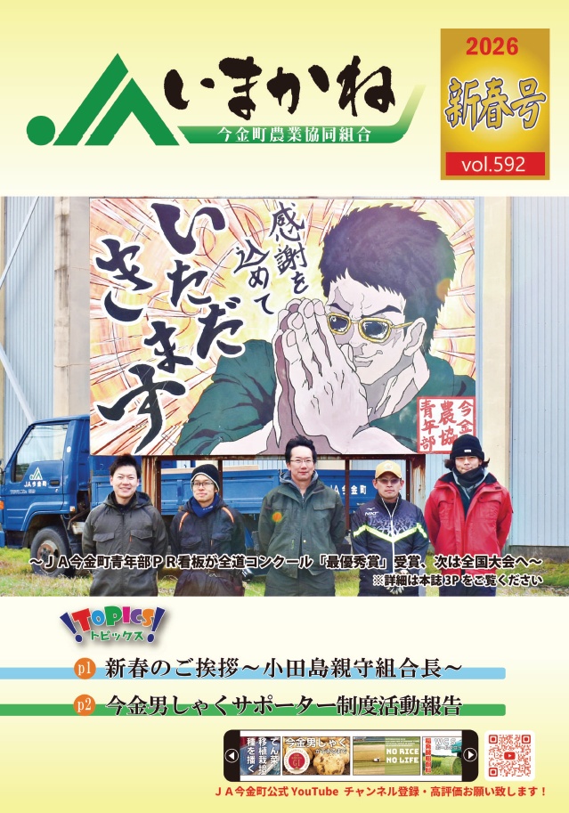 広報誌 ●JA今金町広報誌 農業・JA・地域の話題を掲載しているJA広報「いまかね」です。 表紙をクリックしていただくと、PDFファイルでご覧いただけます。 PDFをご覧になるにはADOBE READERが必要です。 バックナンバー 2026 (1) 2025 (11) 2024 (11) 2023 (11) 2022 (11) 2021 (11) 2020 (11) 2019 (11) 2018 (11) 2017 (11) 2016 (11) 2015 (12) 2014 (12) 2013 (13) 2012 (9) 2011 (8) 2010 (8) 2009 (7) 2026年 新春 vol.592 ホームに戻る バックナンバー 2026 (1) 2025 (11) 2024 (11) 2023 (11) 2022 (11) 2021 (11) 2020 (11) 2019 (11) 2018 (11) 2017 (11) 2016 (11) 2015 (12) 2014 (12) 2013 (13) 2012 (9) 2011 (8) 2010 (8) 2009 (7)